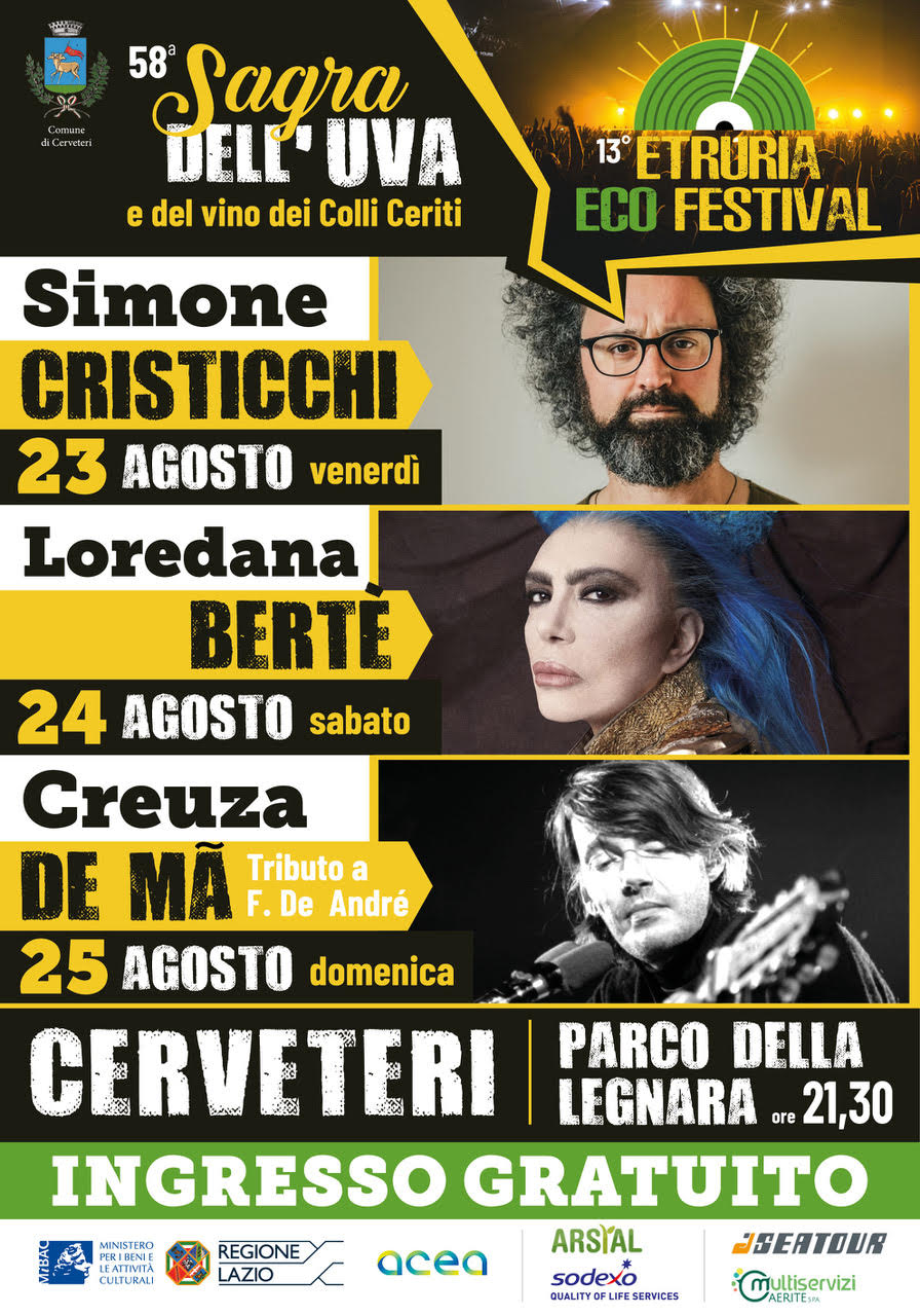 “Questo straordinario appuntamento che vede unirsi Sagra dell’Uva e del Vino dei Colli Ceriti ed Etruria Eco Festival parte dunque con un nome di prestigio della musica italiana, capace ogni volta di regalare grandi emozioni – ha dichiarato Alessio Pascucci, Sindaco di Cerveteri – con un ottimo lavoro di squadra, che ha visto cooperare in sinergia quattro assessorati, quello alla Cultura, quello alle Politiche Agricole, quello alla Promozione e Sviluppo Sostenibile del Territorio e quello alle Attività Economiche e Produttive, abbiamo voluto concludere un’Estate straordinaria per Cerveteri, già reduce dal Jova Beach Party e dai grandi festeggiamenti per il 15esimo anniversario UNESCO, offrendo un evento unico, che fosse capace di abbracciare un pubblico il più vasto possibile”.