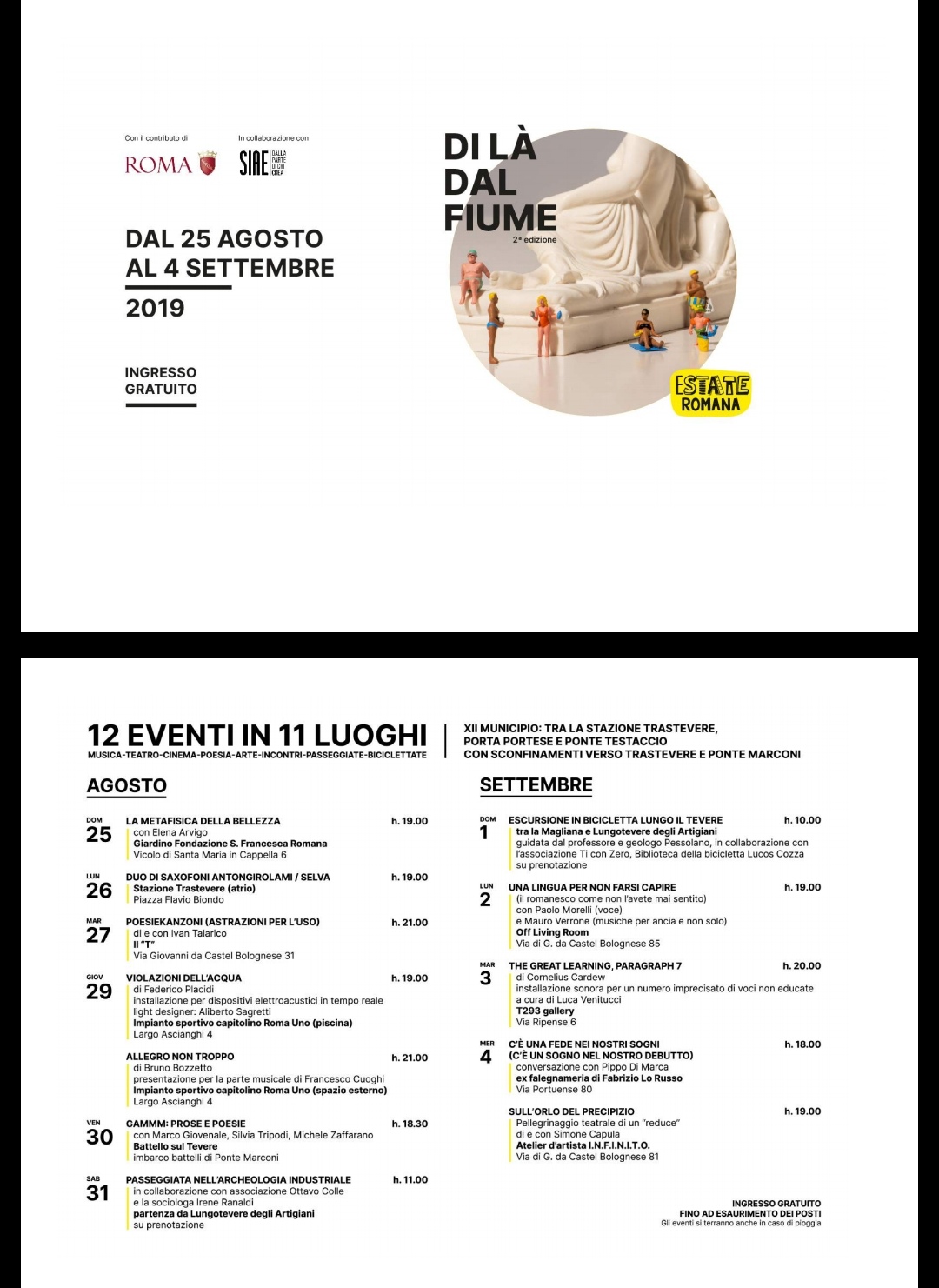 Dodici appuntamenti in 11 luoghi del XII Municipio di Roma, tra la Stazione Trastevere, Porta Portese e Ponte Testaccio, fino a Ponte Marconi. In programma: musica, canzoni, poesie, letture, installazioni sonore, conversazioni sceniche, passeggiate nell’archeologia industriale e pedalate lungo il fiume. Un programma ricco di proposte artistiche alla riscoperta di 11 palcoscenici insoliti come un barcone che da Ponte Marconi si muoverà lungo il Tevere in direzione Magliana o la piscina anni ‘30 dell’impianto sportivo capitolino di Largo Ascianghi, ex Casa della Gioventù Italiana del Littorio (GIL) dell’architetto Luigi Moretti. La scelta di questi palcoscenici insoliti vuole anche essere un omaggio alla memoria dei momenti culturalmente migliori della ricerca teatrale romana degli anni Settanta, quando Roma si trasformava in palcoscenico assoluto e il teatro, l’arte e la poesia comparivano nei luoghi meno prevedibili della città: piscine, barconi, tetti di abitazioni, cavalcavia, aperta campagna e, perfino, stadi. Come ben ricordato nelle note di presentazione dal poeta Marco Giovenale (tra gli artisti presenti al festival): “Di là dal fiume, la città di tutti. La serie di incontri del giovane festival DI LA’ DAL FIUME vuole anche essere un omaggio alla tradizione, alla memoria e alle prospettive dei momenti culturalmente migliori degli anni Settanta, quando ad esempio Simone Carella sceglieva una piscina per una performance e Fabio Sargentini un barcone sul Tevere: costruivano e disseminavano nei quartieri un gran numero di idee, strutture leggere, anche effimere, parole e figure sull’acqua, in barca, oltre il fiume, facendo così uscire il teatro da sé stesso e l’arte – anzi le arti – dalle gallerie”.