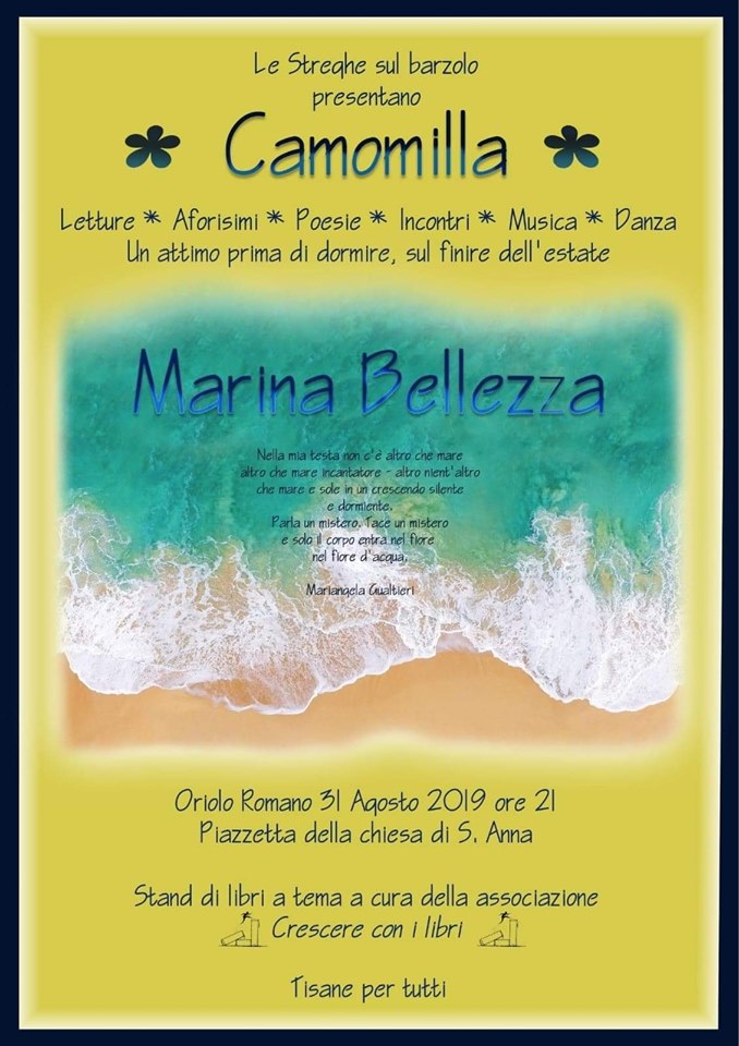 — Si terrà il 31 agosto alle ore 21, ad Oriolo Romano, presso la piazzetta di Sant’Anna “Camomilla d’Estate”, l’ormai tradizionale reading letterario a tema, quest’anno dedicato al mare, alla sua bellezza e ai suoi significati simbolici. Un’occasione di ascolto che permette di spaziare fra diversi registri di scrittura, includendo  testi in prosa e poesia,  densi di spunti di riflessione. La serata è arricchita da momenti di musica e danza e da una pausa conviviale a base di tisane e dolci tipici. Uno spazio e un tempo sospesi, magici, in compagnia di letture d’autore.