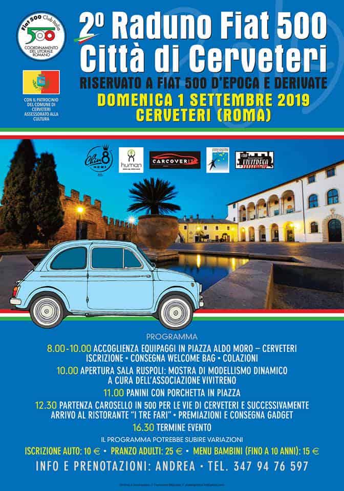 “Piazza Aldo Moro diventerà per una mattinata un enorme museo all’aria aperta dedicato alla FIAT 500 – ha dichiarato Federica Battafarano, Assessora alle Politiche Culturali del Comune di Cerveteri – questa iniziativa già lo scorso anno aveva riscosso uno straordinario successo in termine di partecipazione di auto che di pubblico. Furono infatti oltre 130 le FIAT 500 che avevano preso parte all’iniziativa, che auspichiamo che anche quest’anno così come nei prossimi anni possa rappresentare un appuntamento fisso della nostra estate”.