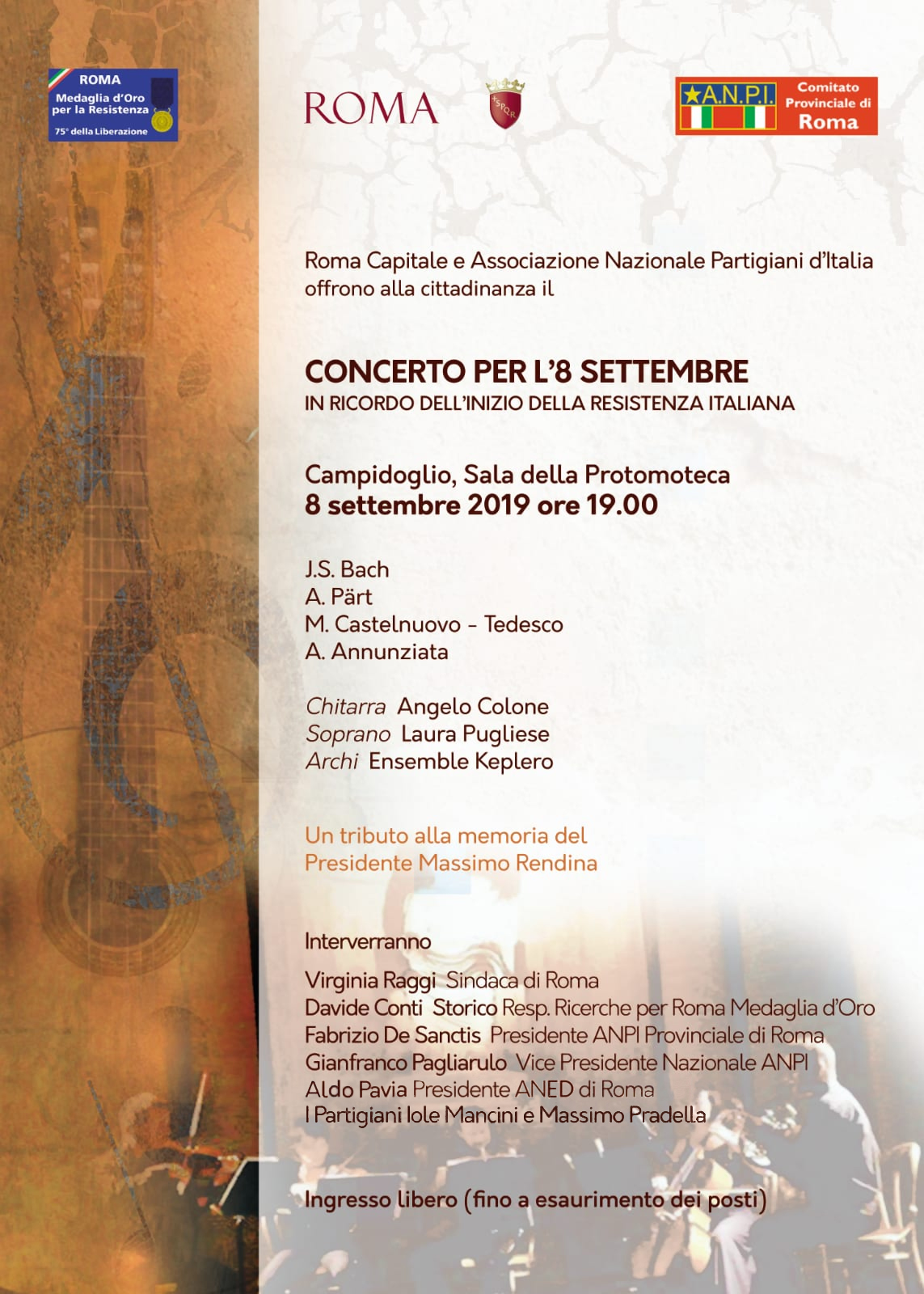 Questo concerto è dedicato a Massimo Rendina, un grande comandante partigiano, un onestissimo giornalista, un testimone e un maestro di democrazia