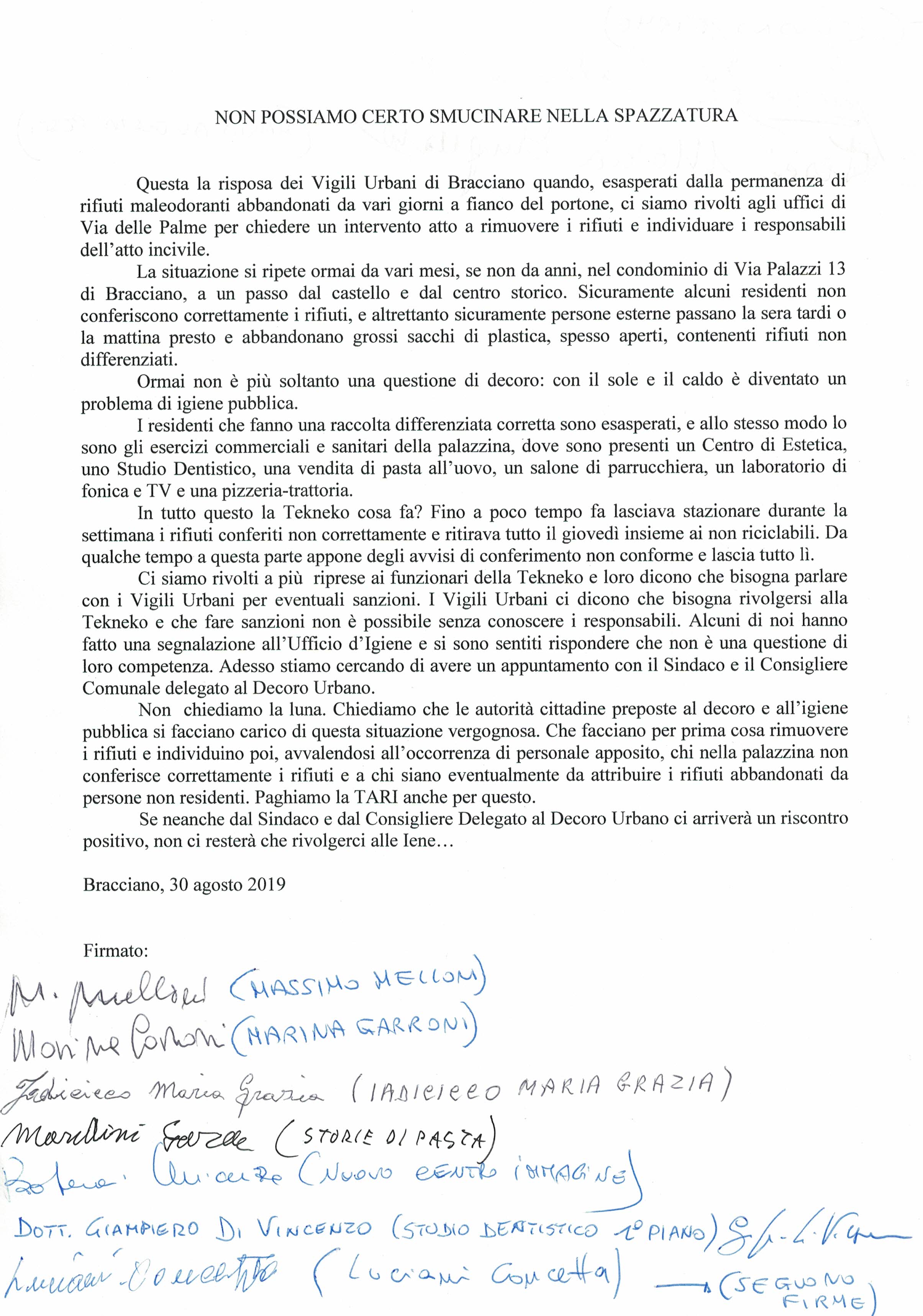 I residenti del condominio di Via Palazzi 13 a Bracciano hanno deciso di inviare una lettera all’amministrazione comunale per risolvere una volta per tutte il problema dell’abbandono dei rifiuti e in cui hanno chiesto di incontrare il Sindaco. Le parti si siederanno a un tavolo per discutere la questione solamente dopo metà settembre. Nel frattempo, comunque, i rifiuti sono stati ritirati e speriamo che la situazione non si ripeta nei prossimi giorni. Ecco la nota dei condomini e le foto che testimoniano le condizioni in cui riversava la zona nei pressi del portone:
