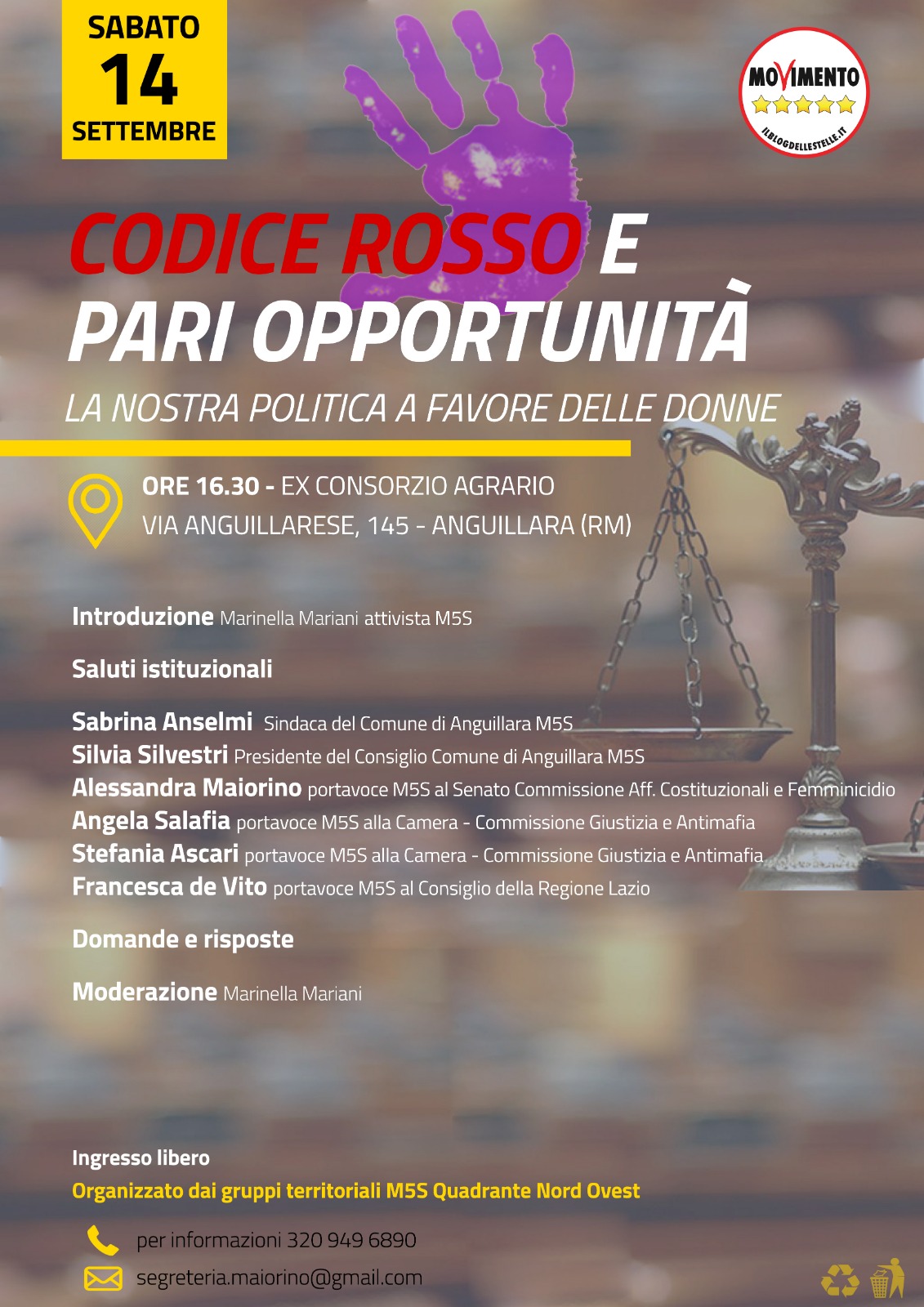 I gruppi territoriali M5s del quadrante nord ovest del Lazio hanno organizzato un incontro cittadino il 14 settembre dalle ore 16, all’ex consorzio di Anguillara Sabazia, per parlare di pari opportunità, codice rosso e le nostre politiche per la donna.