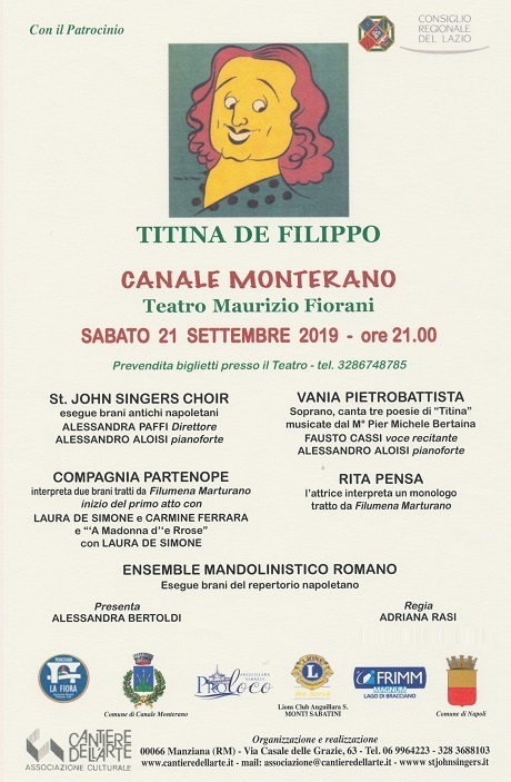 A grande richiesta sul palco del teatro Maurizio Fiorani di Canale Monterano sabato 21 settembre 2019 alle 21 viene riproposto lo spettacolo “Titina De Filippo – Giunse nel nostro territorio …e si fermò tra noi” andato in scena per la prima volta esattamente sei anni prima a Manziana. Fu un evento speciale in occasione del cinquantenario della morte con il quale Manziana tutta volle ricordare la sua concittadina illustre, le cui spoglie oggi riposano nel cimitero comunale. Fu tale il richiamo dello spettacolo del 2013 che il teatro Quantestorie non riuscì ad ospitare i tanti spettatori accorsi per l’evento, tanto che già allora si parlò di una replica imminente. Dopo sei anni finalmente lo spettacolo ritorna.