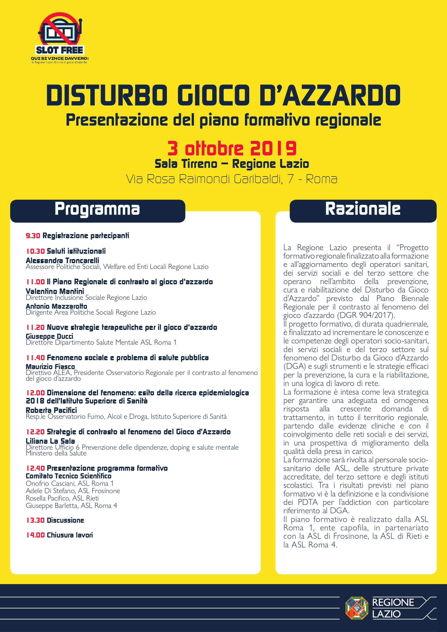 Il progetto di formazione degli operatori rientra nel più ampio piano biennale regionale per il contrasto del gioco d’azzardo patologico promosso dall’assessorato alle Politiche sociali, in collaborazione con la Sanità. Il 3 ottobre sarà anche l’occasione per illustrare gli altri pilastri delle politiche della Regione Lazio contro il Gap.