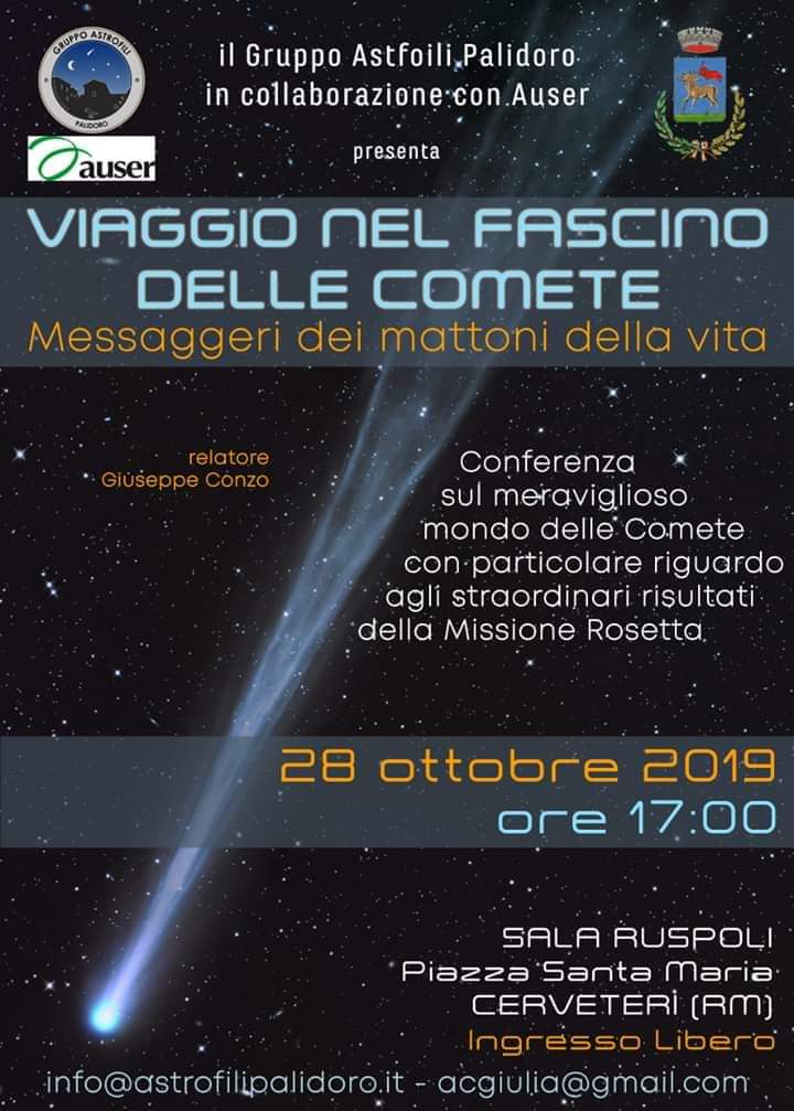 Una vera e propria passeggiata spaziale, un viaggio nel mondo delle stelle, delle comete. “Pilota d’eccezione”, il Gruppo Astrofili Palidoro, che insieme all’Associazione AUSER propone la conferenza “Viaggio nel fascino delle Comete – Messaggeri dei mattoni della vita”, in programma lunedì 28 ottobre alle ore 17:00 nei locali di Sala Ruspoli in Piazza Santa Maria.