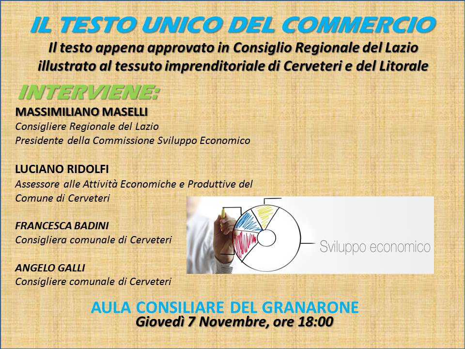 Massimiliano Maselli, Consigliere Regionale del Lazio e Presidente della Commissione Sviluppo Economico alla Pisana sarà a Cerveteri nell’Aula Consiliare del Granarone per un evento pubblico durante il quale presenterà il Testo Unico del Commercio, recentemente approvato con 31 voti favorevoli in Consiglio Regionale del Lazio. L’appuntamento è per giovedì 7 novembre alle ore 18:00 e l’iniziativa è aperta all’intero tessuto economico e commerciale del territorio, oltre che alla cittadinanza tutta.