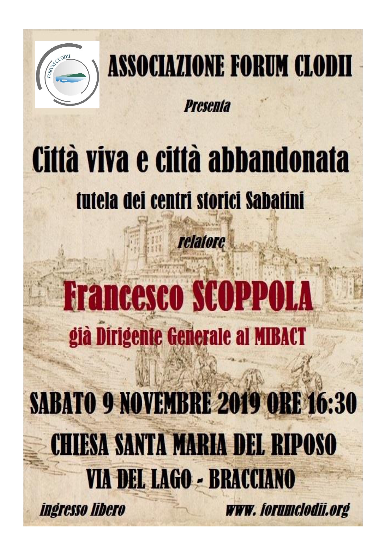 Sabato 9 novembre 2019, alle ore 16.30, presso la sede dell’Associazione Forum Clodii, Chiesa del Riposo in Bracciano, Via del Lago snc, il dott. Francesco Scoppola, già dirigente generale del Ministero dei Beni Culturali e Ambientali, terrà un incontro sul tema: Città viva e città abbandonata, tutela dei centri storici sabatini