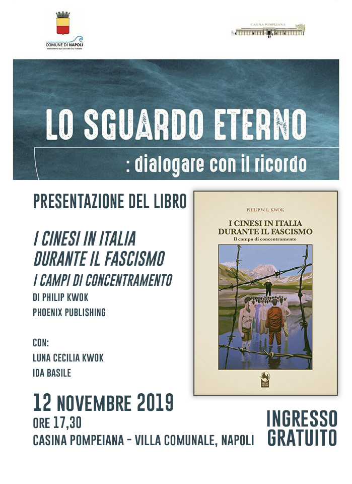 “I cinesi in Italia durante il fascismo”, di Philip W.L. Kwok, per i tipi di Phoenix Publishing, è un volume che tratta una storia poco conosciuta seppur molto vicina a noi, quella dei campi di concentramento istituiti nel nostro paese a scapito dei primi immigrati orientali. A parlarne, Luna Cecilia Kwok e Ida Basile, nell’ambito della mostra LO SGUARDO ETERNO martedì 12 Novembre 2019, ore 17.30, alla Casina Pompeiana in Villa Comunale, Napoli.