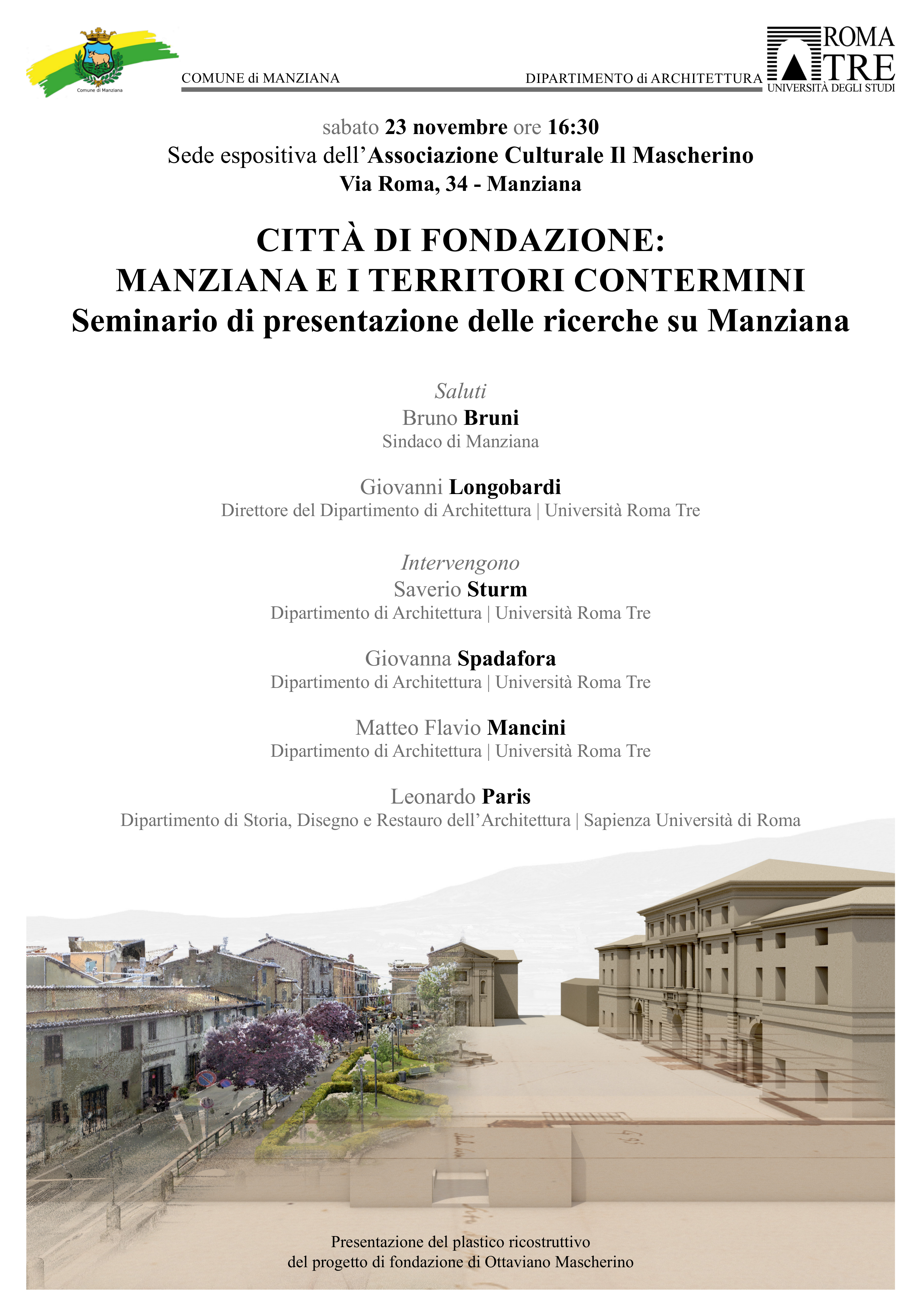 Sabato 23 novembre, alle ore 16:30, presso la sede espositiva dell’Associazione il Mascherino che l’ha gentilmente concessa in maniera gratuita, il Comune di Manziana e il Dipartimento di Architettura dell’Università degli Studi Roma Tre presentano alla cittadinanza, a studiosi e appassionati i primi frutti dell’assegno di ricerca del Dipartimento di Architettura cofinanziato dal Comune di Manziana e volto ad approfondire l’assetto urbano originario di Manziana.