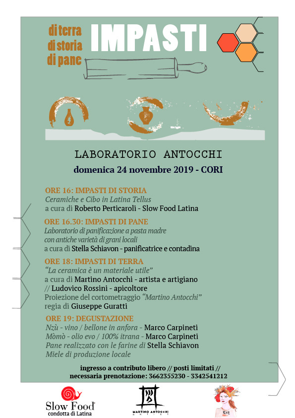 Un luogo magico, anticamente molino per la farina, oggi studio d’arte e artigianato, a Cori, in pieno centro storico, dove Martino Antocchi (artista/artigiano) realizza le sue ceramiche e crea i suoi impasti, DOMENICA 24 NOVEMBRE, diventa location, calda e accogliente, per un evento in cui gli IMPASTI saranno protagonisti. Mani che si intrecciano e creano legami di intimità, l’impasto è soprattutto la memoria di un gesto. Si impasta la terra, come si impasta la farina per fare il pane.