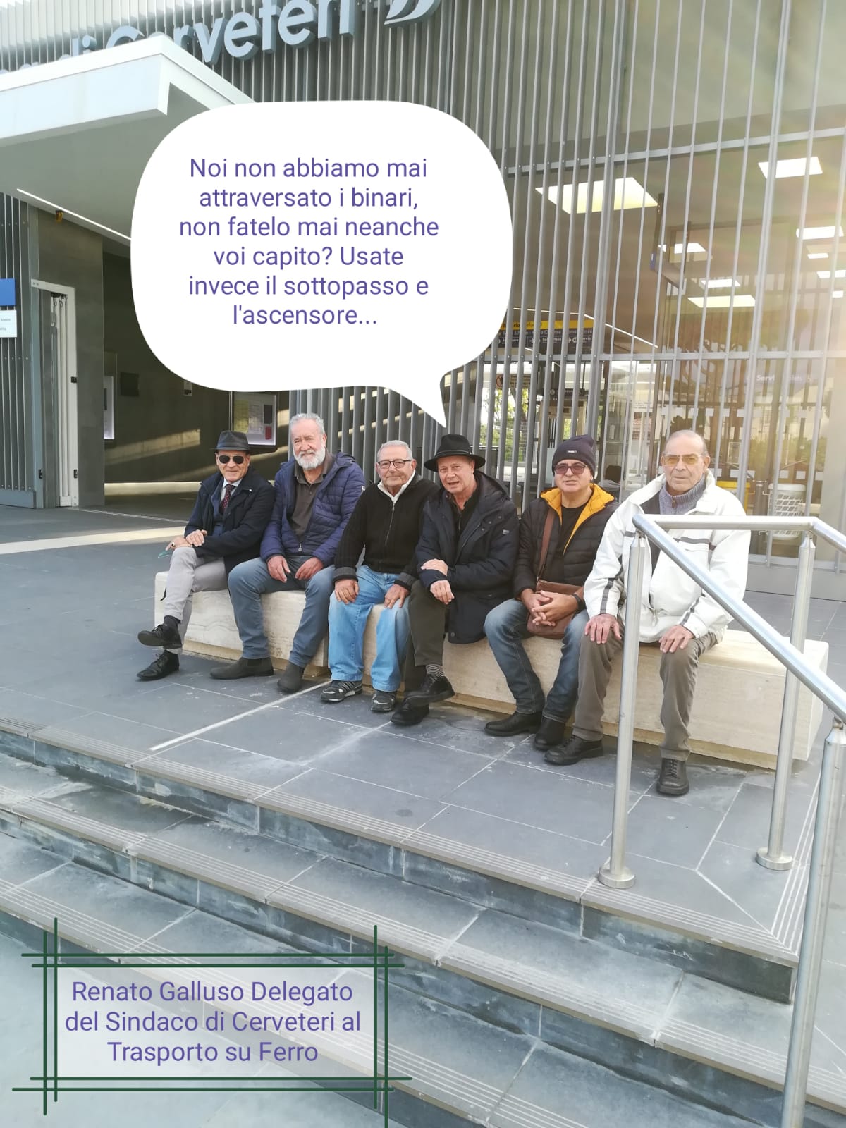 Lo fa con una vignetta simpatica ed ironica, ma allo stesso tempo pungente, una foto che lo ritrae insieme ad alcuni suoi coetanei, seduti fuori la Stazione con la scritta: “Noi non abbiamo mai attraversato i binari, non fatelo mai neanche voi. Capito? Usate invece il sottopasso e l’ascensore”.