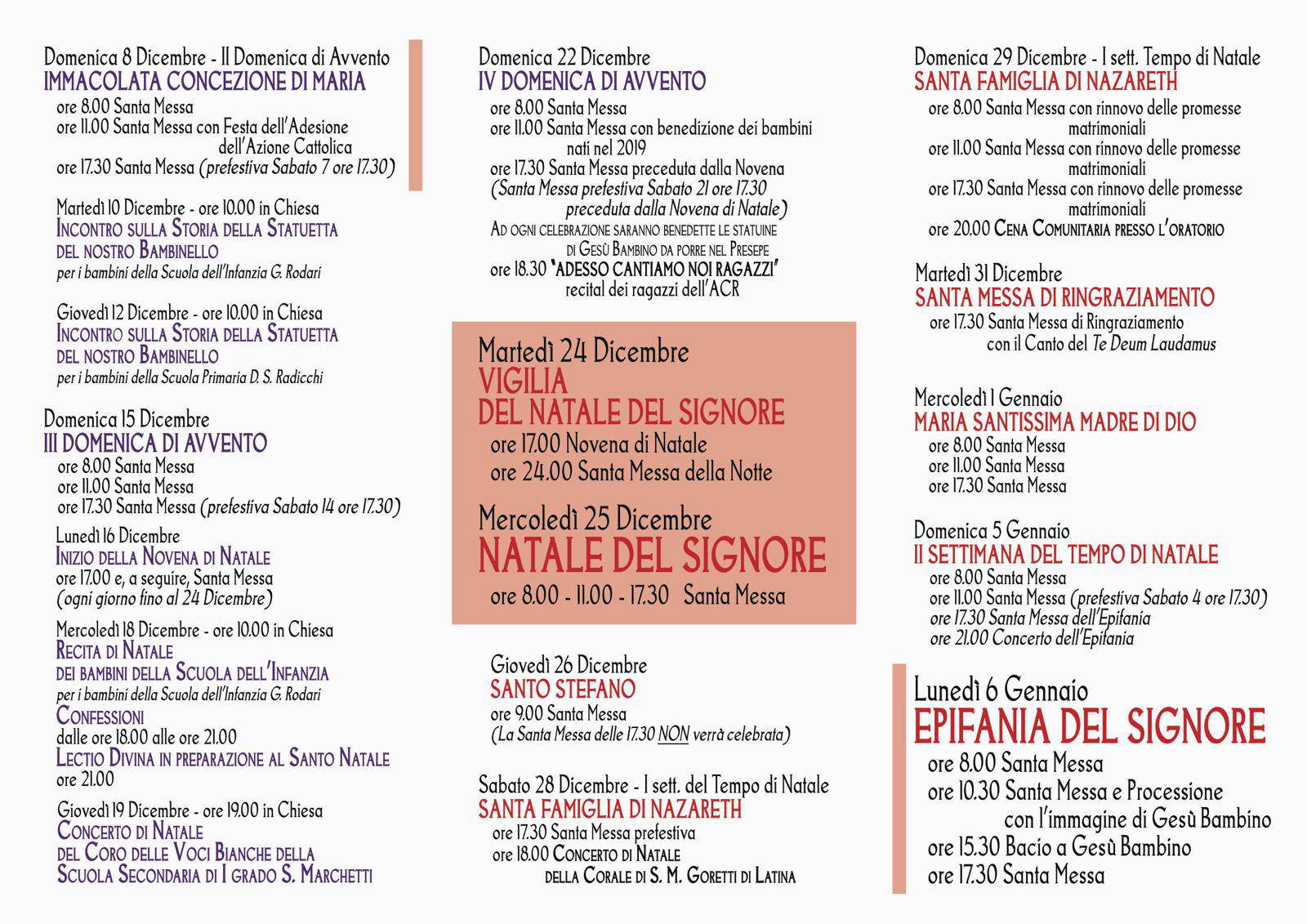 Per il periodo natalizio, la Parrocchia San Giovanni Battista di Giulianello propone alla comunità un calendario di iniziative che si terranno in Chiesa a partire dall’Immacolata Concezione di Maria, fino all’Epifania del Signore. Tra le sante messe risaltano appuntamenti importanti per i parrocchiani: la festa dell’Adesione dell’Azione Cattolica (8 dicembre, ore 11); la benedizione dei bambini nati nel 2019 (22 dicembre, ore 11); la Vigilia del Natale (24 dicembre, ore 24), la Messa di Natale (25 dicembre, ore 8/11/17.30); le tre celebrazioni del 29 dicembre (ore 8/11/17:30) dedicate alla Santa Famiglia di Nazareth che daranno la possibilità di rinnovare le promesse matrimoniali alle coppie di sposi che vorranno, con cena comunitaria presso l’oratorio (ore 20) e il Ringraziamento con canto del Te Deum Laudamus (31 dicembre, ore 17:30).