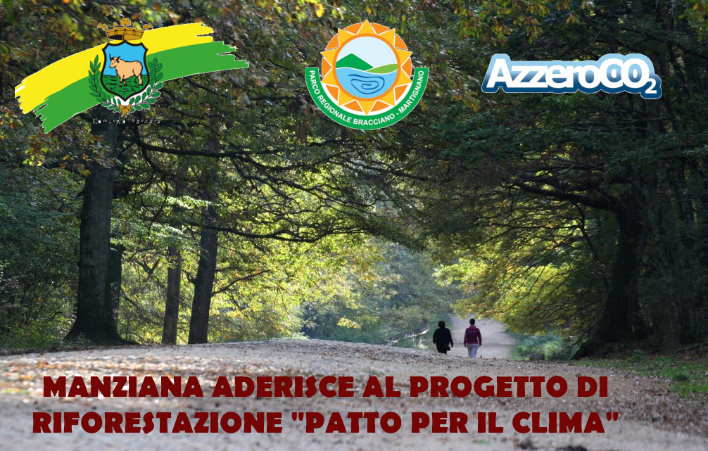 Il Comune di Manziana, con delibera di Giunta n. 155 del 4 novembre 2019, ha approvato il protocollo d’intesa con il Parco Regionale Bracciano-Martignano e la società AzzeroCo2 per la realizzazione di interventi di riforestazione urbana per contrastare i cambiamenti climatici. Azzero CO2 è una società costituita da Legambiente e Kyoto Club e sta promuovendo a livello nazionale la campagna “Mosaico Verde” ed in particolare il progetto “Patto per il Clima” per la riqualificazione di spazi verdi funzionali all’adattamento ai cambiamenti climatici, riducendo i rischi da essi derivanti.