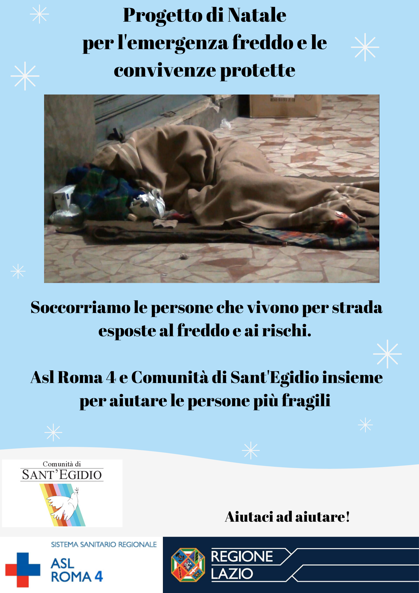 Le motivazioni del progetto di Natale per l’emergenza freddo e le convivenze protette hanno la loro origine nel contesto sociale dei Comuni nel territorio della ASL Roma 4 dove, specie in alcuni come Civitavecchia, Santa Marinella e Ladispoli e Bracciano, a livello alloggiativo, esiste una emergenza sociale; un rilevante numero di persone vivono per la strada in condizione di senza fissa dimora oppure in luoghi di fortuna o abbandonati, non forniti di elettricità, fognature ed altri servizi essenziali. La Comunità di Sant’Egidio, ha in questi anni offerto delle risposte e delle soluzioni efficaci a questa problematica attraverso il progetto delle convivenze protette svolto in collaborazione con la ASL Roma e diffuso soprattutto nel Comune di Civitavecchia e per iol quale è in atto una Protocollo di intesa tra Sant’Egidio, la ASL Roma 4 ed il Comune.