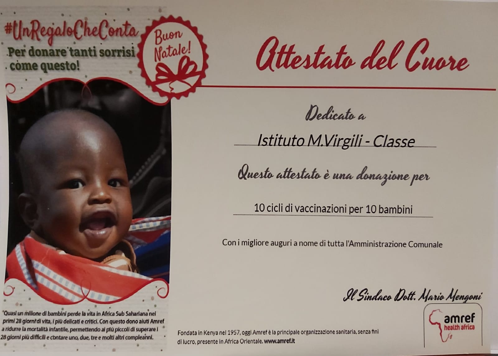 Ogni classe ha ricevuto infatti un attestato di donazione di dieci cicli di vaccinazioni per dieci bambini in Africa legati ad Amref Italia, la più grande organizzazione sanitaria presente nel continente africano dal 1957. L’obiettivo specifico di quest’anno di Amref è proprio quello di contribuire a combattere la mortalità neonatale, nei primi 28 giorni di vita, attraverso donazioni e regali di Natale.