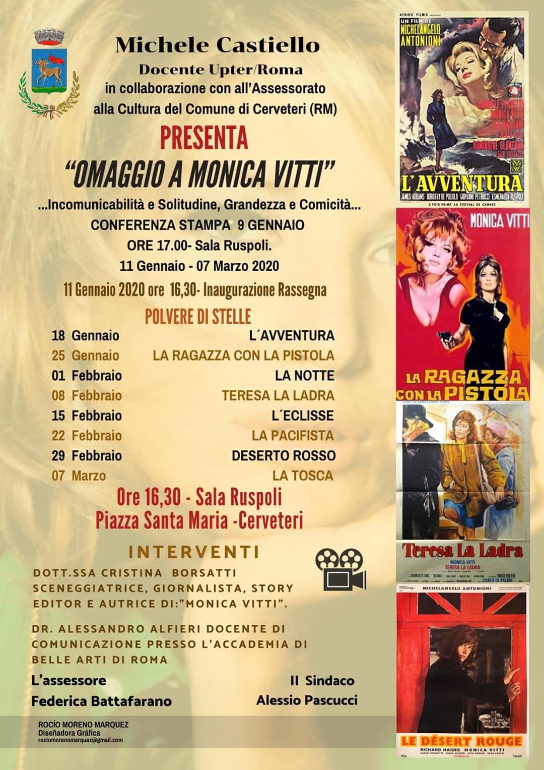 Dopo il successo e l’interesse per il ricordo di Pier Paolo Pasolini, torna sempre in sala Ruspoli a Cerveteri, una serie di appuntamenti dedicati, finalmente aggiungo io, ad una delle più grandi interpreti del nostro Cinema, Maria Luisa Ceciarelli. Molto semplicemente, Monica Vitti.