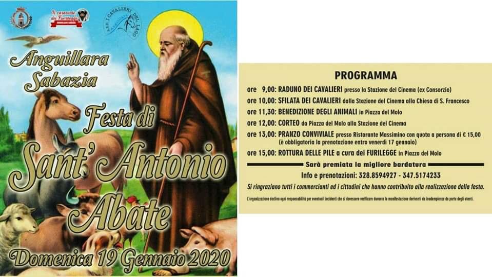 Anguillara Sabazia festeggia magnificamente Sant’Antonio. Appuntamento per la festa di Sant’Antonio Abate ad Anguillara Sabazia domenica 19 gennaio 2020 dalle 9.00 dal raduno dei cavalieri presso la stazione del cinema alle 15.00, alla tradizionale e rinnovata rottura delle pile in piazza del Molo. Alle 10.00 i cavalieri sfilano dalla stazione del cinema alla chiesa di s. Francesco per poi dirigersi accompagnati dalla Banda della Citta’ di Anguillara Sabazia in piazza del Molo. Imperdibile la benedizione degli animali in piazza del molo alle 11.30. Ore 12.00 corteo da Piazza del Molo alla Stazione del Cinema. Ore 13.00 pranzo conviviale con quota a persona di 15 euro presso ristorante Massimino. Ore 15.00 rottura delle pile in piazza del Molo a cura dei Fuorilegge. Sara’ premiata la migliore bordatura. L’evento ha il patrocinio e il contributo della città di Anguillara Sabazia, guidata dal sindaco Sabrina Anselmo e delegata agli eventi, in collaborazione con assessorato tecnico cultura Viviana Normando e con delegata all’ambiente Silvia Silvestri. L’organizzazione della festa è a cura dell’Associazione Cavalieri del Lago, in collaborazione per la rottura delle pile con Associazione dei Fuorilegge come avvio al Carnevale che avrà luogo ad Anguillara il 22 e 23 febbraio in particolare. Bella la collaborazione con la Parrocchia di S. Maria Assunta e con la Parrocchia di Regina Pacis. Grande attesa per la festa di Sant’Antonio! Vi aspettiamo! Per info e prenotazioni: 3288594927; 3475174233. Ad Anguillara poi nel pomeriggio nella Sala Orsi accanto alla Chiesa di Regina Pacis ci sara’ lo spettacolo teatrale “Natale al basilico”, di Valerio Di Pirano, a cura dell’associazione teatrale il Battello, alle ore 18.30. Ricordiamo che e’ possibile scaricare app Città di Anguillara Sabazia e visionare www.comune.anguillara-sabazia.roma.it.