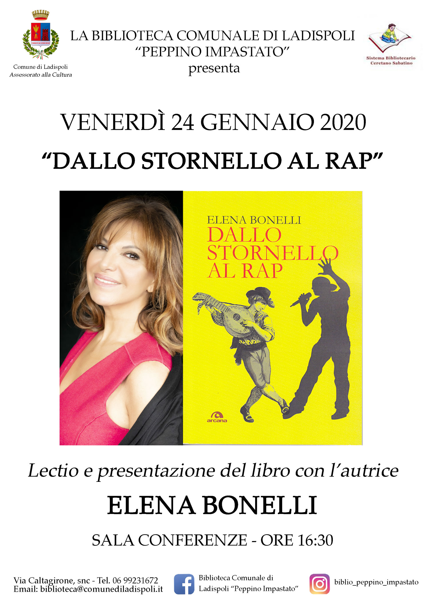 “L’artista romana Elena Bonelli, definita la voce di Roma, – afferma l’assessore alla cultura, Marco Milani – continua la sua storica mission: quella di riportare in auge il grande patrimonio artistico e culturale che è la canzone romana. Dopo tutti i successi ottenuti dalle sue tournèes nel mondo e lo strepitoso successo dell’ultima stagione teatrale con “Magnani Ferri – Vite da Romanzo” spettacolo dedicato alle due indimenticabili icone di Roma, Elena Bonelli lancia la sua inedita avventura editoriale, il suo libro “Dallo Stornello al Rap” primo saggio sulla storia della musica di Roma e del Lazio, dall’antica tradizione degli stornelli fino alla nascita della vera canzone romana e alla sua evoluzione arrivando ai giorni nostri ed al rap, facendoci scoprire che lo stornello di ieri non è nient’altro che il rap di oggi, analizzandone ogni connessione”. L’uscita di questo libro, edito da Arcana del gruppo LIT EDIZIONI, sarà accompagnata da un intenso calendario di eventi/presentazioni nelle quali l’artista incontrerà il pubblico tenendo la sua Lectio Magistralis, dal titolo omonimo, sugli argomenti trattati nel volume che, con grande riscontro da parte degli spettatori, ha già tenuto nelle Università di Roma e del mondo, dalla Luiss a Tor Vergata, fino in Florida, Georgia, Angola, Cina e Giappone. Il prossimo appuntamento per questo tour laziale è fissato il 24 Gennaio presso La Biblioteca Comunale “Peppino Impastato” di Ladispoli nella sala Conferenze per ascoltare in un ora, come in un viaggio attraverso i secoli, la storia della canzone romana e dello stornello ed il perché quest’ultimo non sia altro che il progenitore del rap di oggi. Un meraviglioso ed inedito evento che sorprenderà i più giovani e che interesserà anche i meno giovani, aprendo agli uni e agli altri diverse chiavi di lettura sulla canzone romana e sulla comprensione dei due generi musicali.