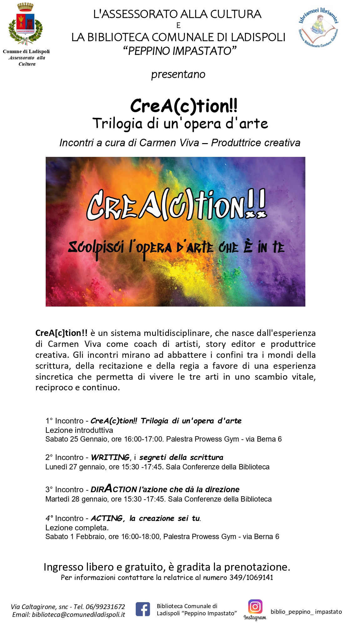 L’amministrazione comunale informa che l’assessorato alla Cultura e la Biblioteca di Ladispoli Peppino Impastato, organizzano il corso CreA(c)tion!! Scolpisci l’opera d’arte che è in te, a cura di Carmen Viva, produttrice creativa, artist coach e story editor.