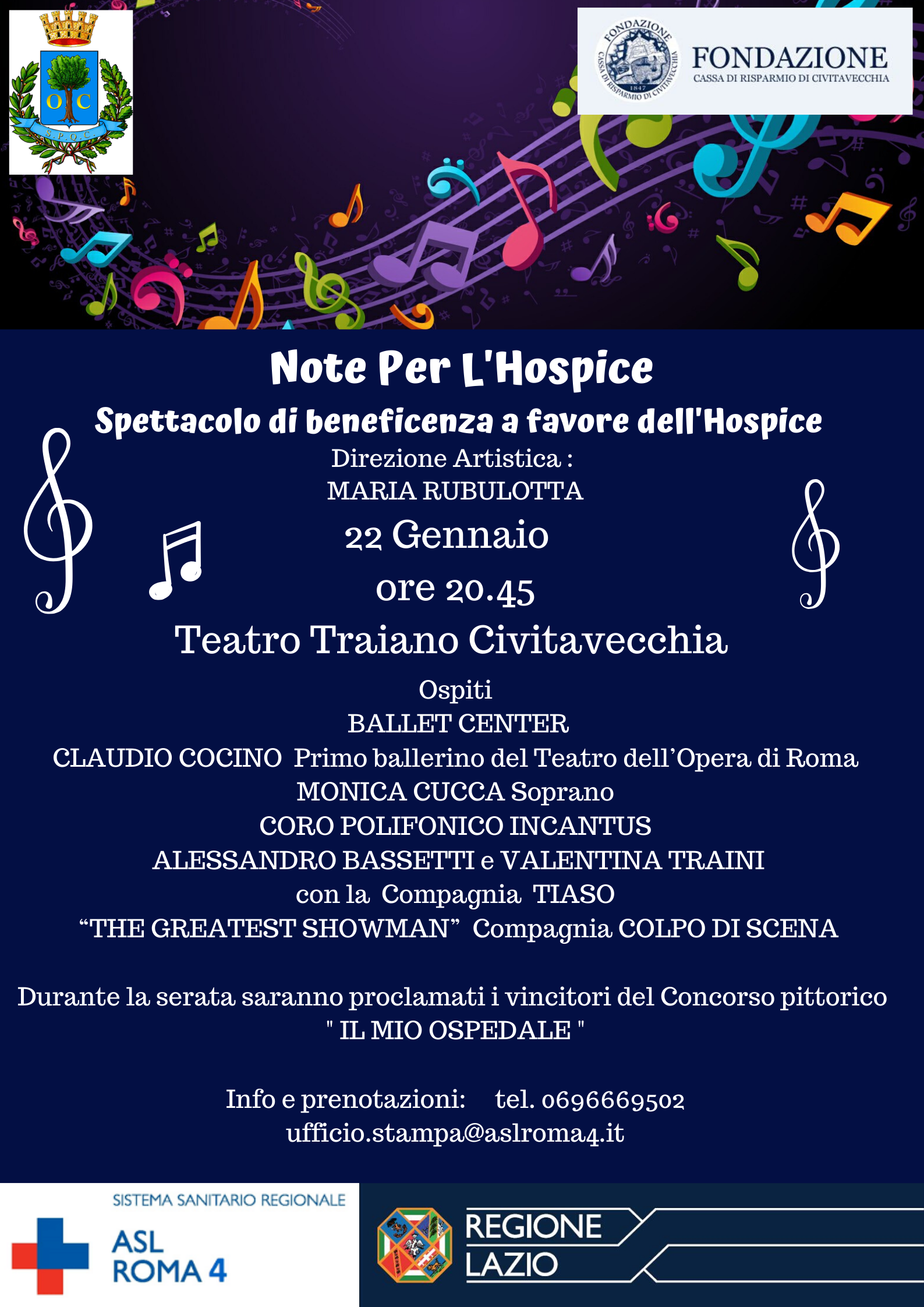 Durante lo spettacolo verranno proclamati i vincitori del concorso pittorico “Il Mio ospedale” il concorso che è stato indetto dalla Asl Roma 4, prima delle feste natalizie, per dare lustro al nuovo atrio dell’Ospedale San Paolo di Civitavecchia, con opere di artisti locali, che hanno voluto interpretare nel colore e nelle linee di quell’arte splendida che è la pittura, l’appartenenza e il vanto di un ospedale che si sta vestendo di nuovo e di bello.