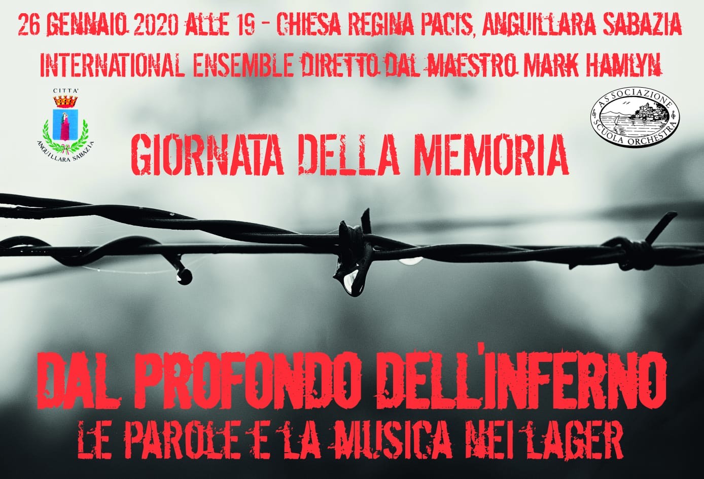 Voci recitanti Katia Tuzi e Noemi Castorina. Ingresso libero. “Questo e’ un concerto testimone di una cultura di pace – dichiara la dott.ssa Viviana Normando l’assessore alla cultura, ai diritti umani ed alla pace e vice sindaco. Una pace così tragicamente conquistata ed ancora inaccettabile, le cui urla e sofferenze silenti del passato scuotono le coscienze ed insegnano, per il tramite della bellezza dell’arte, che taluni drammi e atti disumani non debbono ripetersi per nessuna motivazione al mondo, nei confronti di nessuno. Quanta bellezza e paradossale conforto nella disperazione, sofferenza di un’umanità, la nostra, possono esserci in chi vive gli ultimi istanti della propria vita e con l’arte riesce ancora ad esprimersi, lo scopriremo proprio in questo concerto, una maniera per non dimenticare”. E’ possibile scaricare l’app città di Anguillara Sabazia da qualsiasi telefono. www.comune.anguillara-sabazia.roma.it