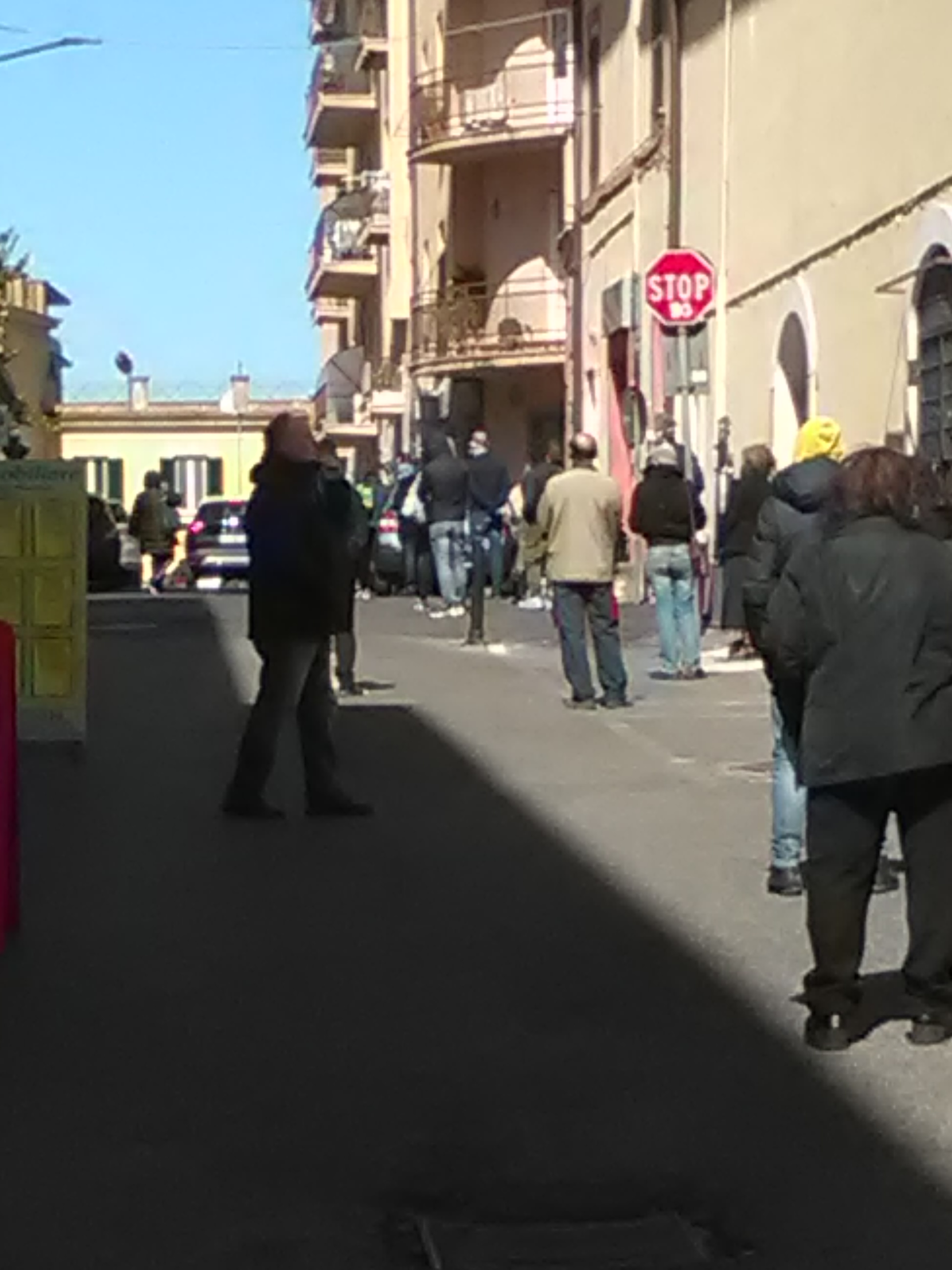 mattino davanti alla Posta, i cittadini erano tutti a rigorosa distanza di un metro l’uno dall’altro, molti con