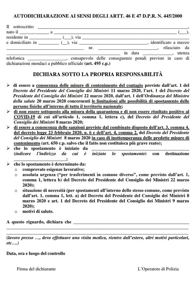 Nella prima parte, tra i provvedimenti di cui deve dichiarare di essere a conoscenza, ci sono anche il Dpcm del 22 marzo e l’ordinanza del ministero della Salute del 20 marzo “concernenti le limitazioni alle possibilità di spostamento delle persone” nel territorio nazionale.