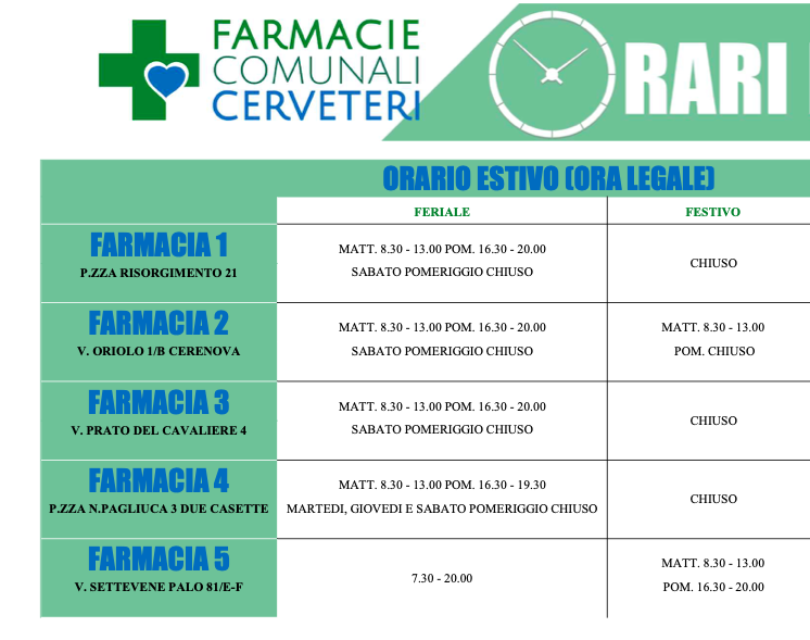 La Multiservizi Caerite comunica che con l’entrata in vigore dell’ora legale a partire da lunedì 30 marzo le farmacie comunali di Cerveteri adegueranno come di consueto gli orari alla stagione estiva.