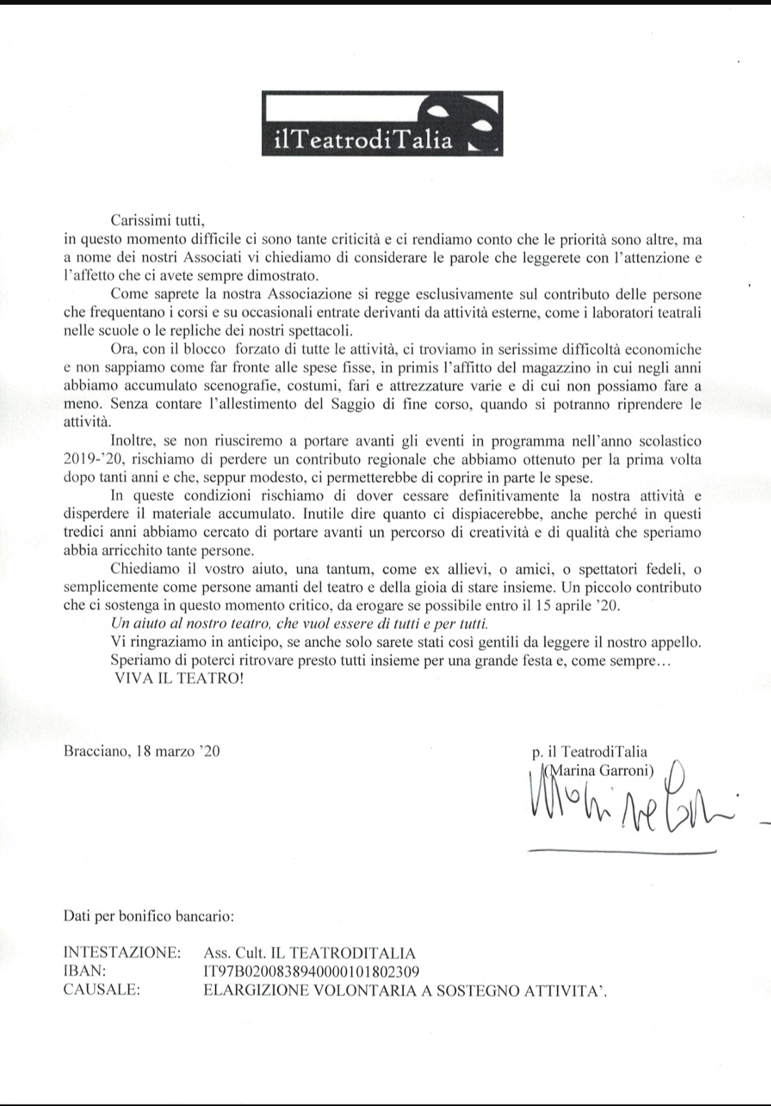 “Il TeatrodiTalia”di Bracciano si rivolge ai suoi spettatori e a chi ama il Teatro