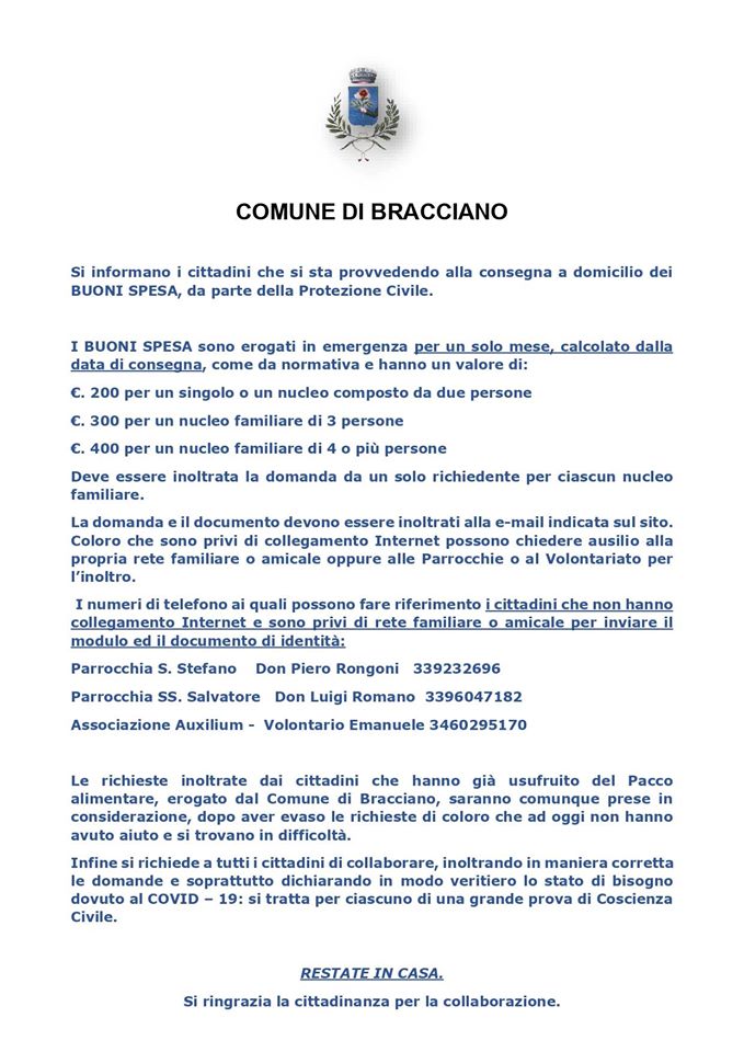 Bracciano: Consegna a domicilio dei buoni spesa da parte della Protezione Civile