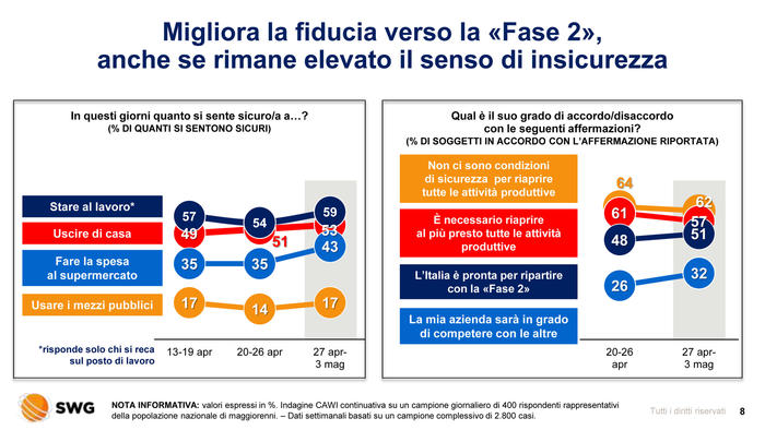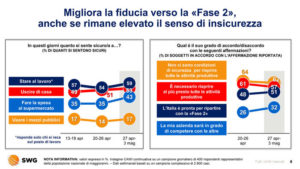 Meno della metà (il 39%) le approva del tutto, mentre la metà si divide tra chi le ritiene troppo restrittive e chi invece le valuta non sufficientemente prudenti. Se gran parte delle singole misure risultano largamente condivise, sono invece considerate eccessivamente restrittive da più di un terzo dei cittadini le posticipazioni delle riaperture di parrucchieri, bar e ristoranti, ma anche il prolungamento del divieto di celebrare la Messa. In parte preoccupa invece la riapertura dei parchi e dei negozi.