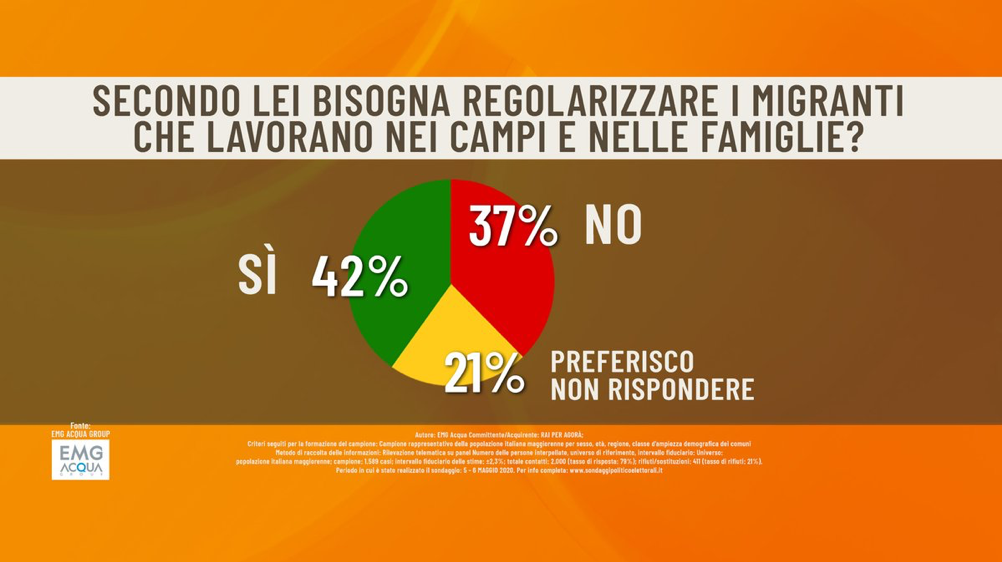Decisamente più divisiva è invece la questione che sta agitando le acque in seno allo stesso Governo in queste ore: la regolarizzazione degli stranieri impiegati (spesso con modalità di vero e proprio sfruttamento) nel nostro settore agricolo. Su questa proposta, avanzata con vigore dalla ministra Bellanova e fortemente avversata da Lega e FDI (ma anche da esponenti del M5S) gli italiani sono spaccati: prevalgono leggermente i favorevoli (42%) sui contrari (39%) ma una quota consistente (21%) non si esprime.
