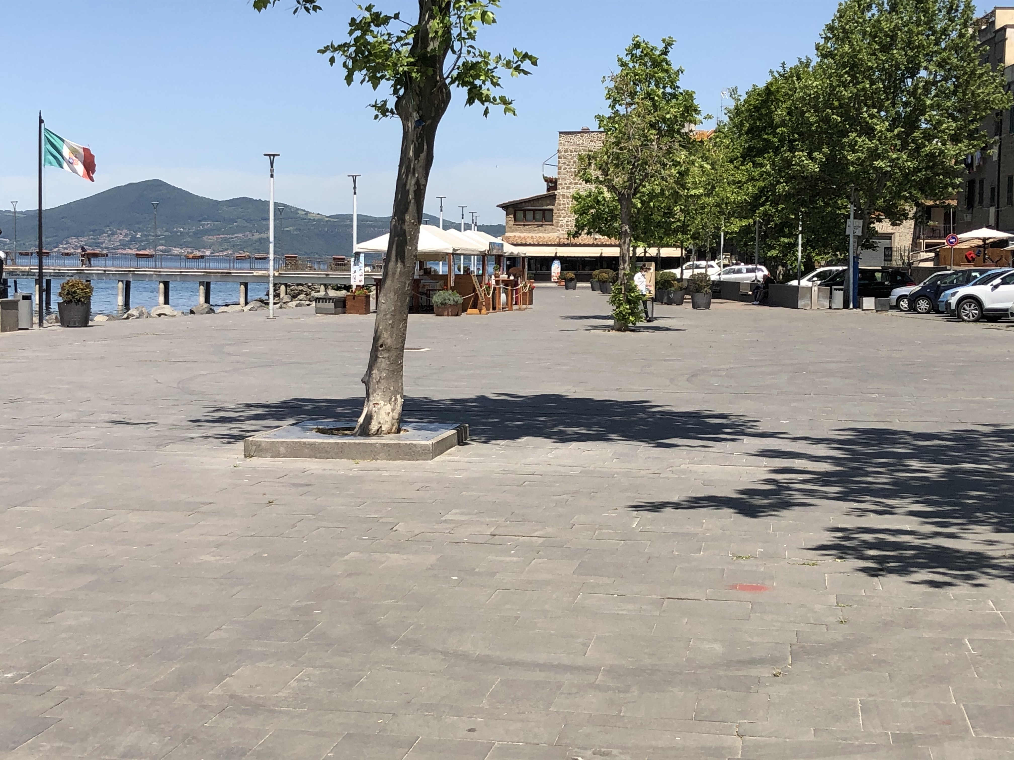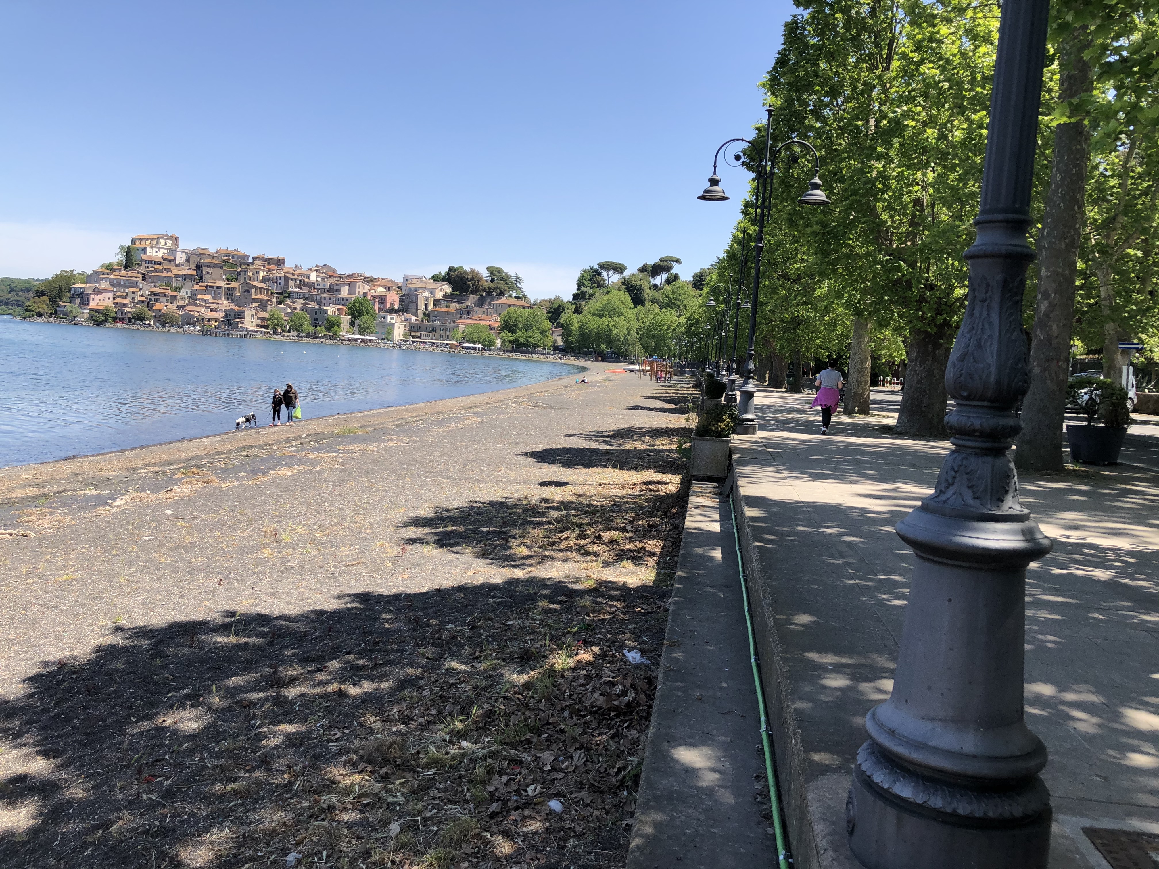 TREVIGNANO: il lungolago quasi deserto; si vedono prevalentemente giovani e bambini accompagnati da genitori e nonni