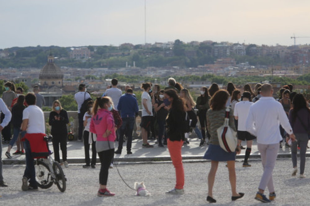 Coronavirus Nel belvedere di Monte Ciocci, parco comunale tra la Balduina e il Trionfale, ci si accalca a centinaia sul muretto vista Cupolone.