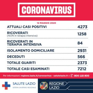 Il bollettino del Coronavirus a Roma e nel Lazio del 12 maggio 2020. Nella Capitale si registrano 12 nuovi casi ma zero decessi. Nell’intera provincia di Roma i contagi sono 21, due le persone morte: una donna di 79 anni e un uomo di 78. Nessun nuovo caso e nessun decesso nelle province di FrosinoneRieti e Viterbo. In provincia di Latina un solo nuovo caso e due morti. Nel Lazio i nuovi casi complessivamente sono quindi 22 e i decessi sono 4.