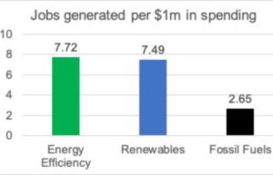 Già nel breve termine, la costruzione di infrastrutture per le rinnovabili crea più del doppio di posti di lavoro per dollaro rispetto agli investimenti in combustibili fossili, oltre ad essere meno suscettibile alla delocalizzazione. Ogni milione di dollari di spesa pubblica genera 7,72 posti di lavoro nell’efficienza energetica, 7,49 posti di lavoro nelle energie rinnovabili e solo 2,65 nei combustibili fossili.