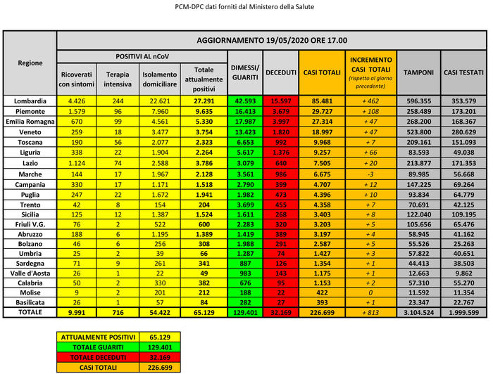 Andamento altalenante per i contagi. Sono 226.699 i contagiati totali per il coronavirus in Italia, 813 più di ieri. Di questi oltre il 50% in Lombardia, che ne fa registrare 462. Il dato comprende attualmente positivi, vittime e guariti. Ieri l’incremento era stato di 451. Da notare però che i tamponi effettuati sono circa il doppio di ieri. Il dato è stato reso noto dalla protezione civile.
