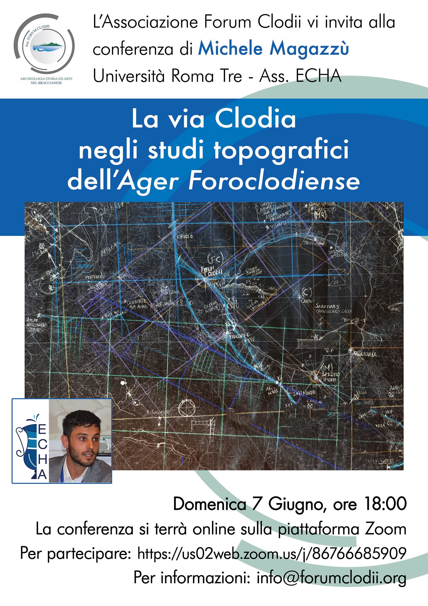 Con questa seconda conferenza in diretta on line della Forum Clodii il dott. Michele Magazzù, brillante architetto dell’Università di Roma Tre e presidente dell’Associazione ECHA, ci porterà a scoprire il tracciato della via Clodia.
