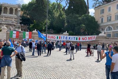 Alcune decine di manifestanti si sono riuniti questa mattina a piazza del popolo per un manifestazione contro le politiche monetarie europee. In piazza, tra gli altri, gli aderenti a Vox Italia e ad altre formazioni che chiedono l’Italexit, come si legge in un cartello affisso sul muro sotto il Pincio. Distanze di sicurezza rispettate tra i manifestanti, pochi senza mascherina.