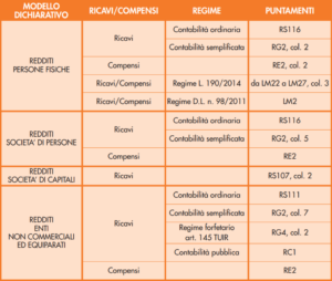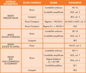 L’Agenzia delle Entrate, al fine di semplificare ed evitare errori nel processo di determinazione dei ricavi/compensi relativi al 2019, ha pubblicato la seguente tabella riepilogativa dei campi della dichiarazione dei redditi (2020 per il 2019) ai quali far riferimento: