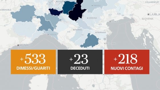 Il calo dei malati (ovvero le persone attualmente positive) è stato pari a 335 unità (ieri erano stati 240) mentre i nuovi contagi rilevati nelle ultime 24 ore sono stati 218 (ieri 224).