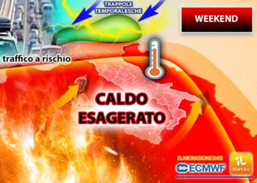 L’aria caldissima in arrivo dal cuore dell’Africa farà salire i termometri che nel corso della settimana raggiungeranno picchi di 40°C su Sardegna, Sicilia e Puglia, 32-36°C diffusi al Nord e al Centro. Il sole sarà prevalente e i temporali pomeridiani interesseranno soltanto le Alpi più settentrionali e le zone adiacenti ad esse.