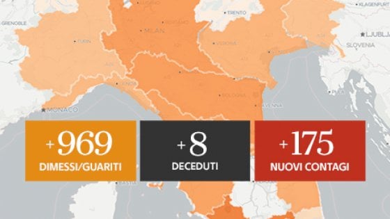 Scende ancora il dato dei contagi da coronavirus in Italia. Oggi si registrano 175 nuovi malati (ieri erano stati 259), mentre il numero dei decessi è il più basso dal : nelle ultime 24 ore sono 8 le vittime. Complessivamente i morti salgono a 34.716. Nel dettaglio, si segnalano 2 vittime in Lombardia, 1 nel Lazio, 3 in Piemonte, 1 in Umbria e 1 in Liguria. In tutte le altre Regioni zero decessi.
