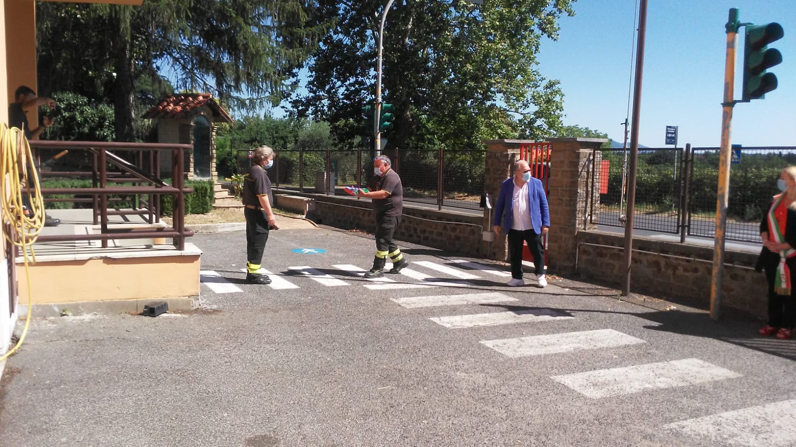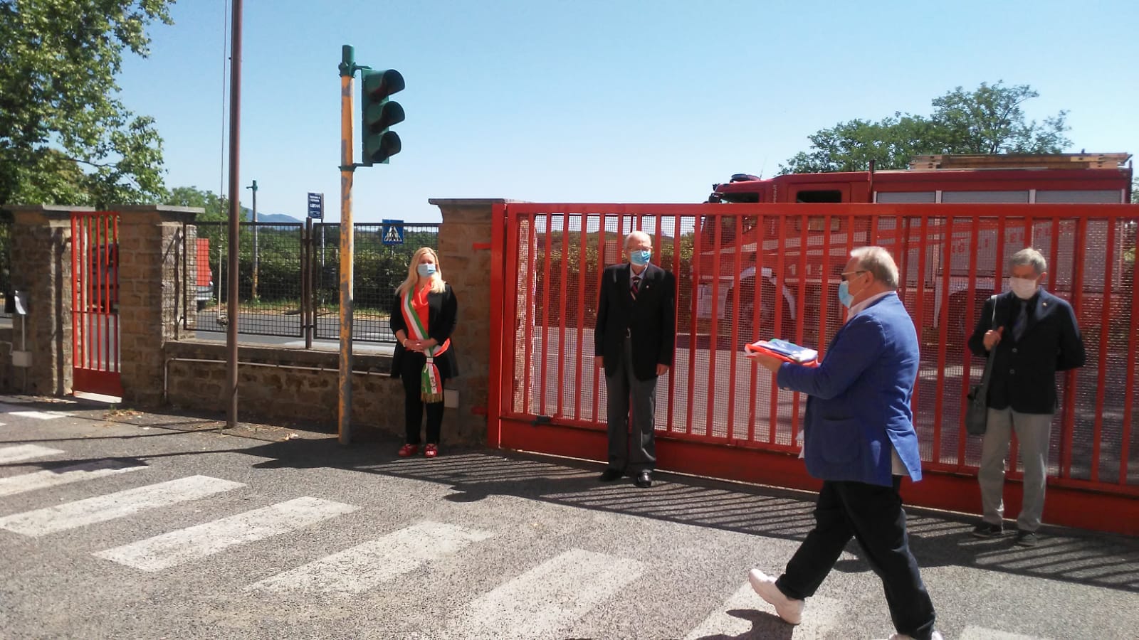 Con un austera ma significativa cerimonia, in un ambiente di sicurezza ( mascherine e distanze) causa coronavirus, nella mattina del 27 giugno, il Lions Club Bracciano Anguillara Sabazia Monti Sabatini ha donato le bandiere d’Italia e d’Europa ( con relative aste precedentemente fornite) alla Caserma del Distaccamento dei Vigili del Fuoco di Bracciano. Hanno presenziato il Presidente dei Lions, Gen. Bruno Riscaldati, il Capo Sede dei Vigili, C.R.E. Pasquale Stringini, l’Assessore alla Cultura della locale Amministrazione con fascia tricolore, Dott.ssa Claudia Marini in rappresentanza del Sindaco, Dott. Armando Tondinelli, il Presidente dell’Associazione Culturale L’Agone Nuovo, Ing. Giovanni Furgiuele, Soci Lions e numerosi Vigili.
