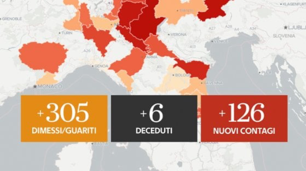 Sono 126 oggi i nuovi contagiati da Coronavirus, in flessione rispetto a ieri quando erano stati 174.