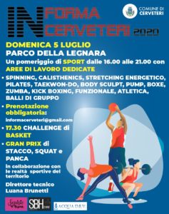 La voglia di tornare a fare sport. Con questo spirito, l’Assessorato allo Sport del Comune di Cerveteri propone l’iniziativa “InForma Cerveteri 2020”, un pomeriggio dedicato all’attività motoria all’aperto nella cornice del Parco della Legnara, che si svolgerà domenica 5 luglio a partire dalle ore 16:00.
