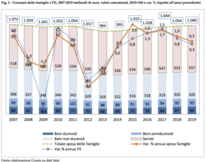 del Pil nazionale è costituito dai consumi delle famiglie, mentre la media UE è decisamente più contenuta (53,5%) con alcuni grandi paesi come Francia e Germania che oscillano intorno al 51%.