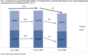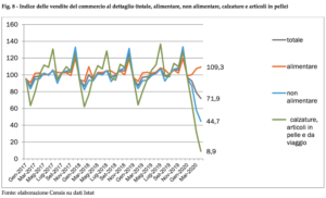 Come prevedibile, sono crollati i consumi (-6,4%) e la percentuale è destinata a salire al 12% se si escludono i beni alimentari e par la casa. Non solo, ma l’e-commerce ha decollato visto che ci siamo trovato di fronte ad un vero e proprio boom degli acquisti sulle piattaforme online. In questo periodo infatti, ha fatto compere con un clic oltre il 25%.