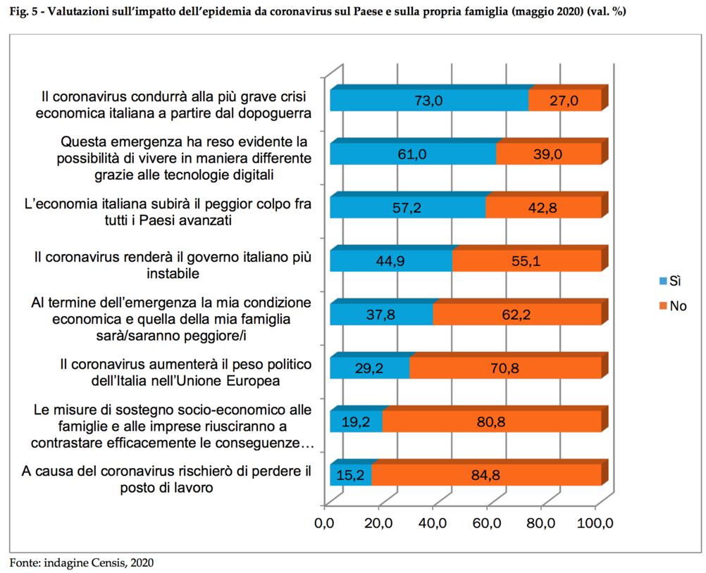 La pandemia ha tolto l’ottimismo agli italiani: i tre quarti della popolazione sono convinti che l’impatto complessivo sull’economia del Paese sarè superiore a quello delle due ultime recessioni, quella del 2008-2009 e quella del debito 2011-2012. Non solo, ma più della metà degli italiani (57,2%) sono convinti il colpo che subirà il nostro Paese sarà più forte di quello che sperimenteranno gli altri Paesi avanzati. E nel frattempo solo il 19,2% del totale ritiene che le misure di sostegno attivate dal Governo riusciranno a contrastare efficacemente le conseguenze economiche della crisi sanitaria.